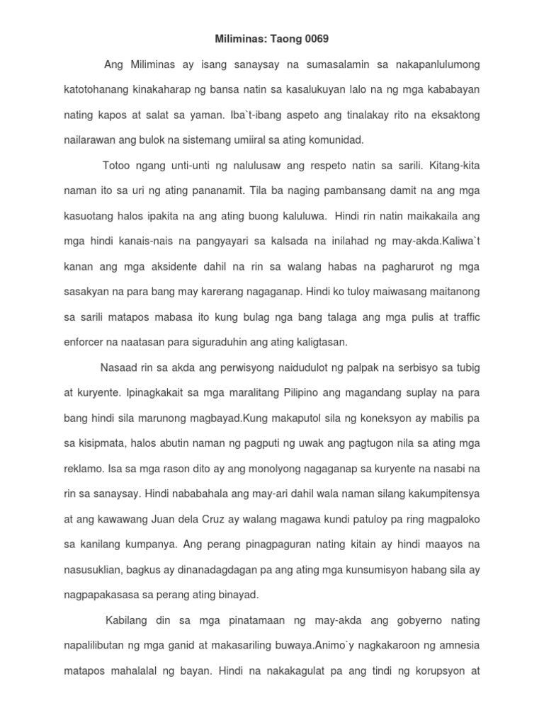 Miliminas Sanaysay Miliminas Taong 0069 Ni Nilo Par Pamonag Salin Ni Ruby V Gamboa Alcantara Studocu