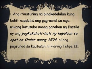 Zaldy Carreon De Leon Jr. Natagpuan naman ni Dr. Nais nating mahalin at alagaan ang ating mga katutubong wika dahil mga pamana ito ng lahi na kailangan para sa pagkatha ng isang bansang Filipino.